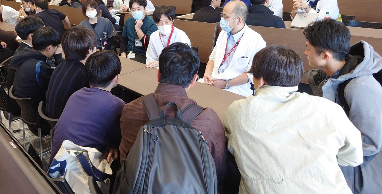 その後、診療科ごとのブースを設けて、学生と教員との懇談会を開催しました。学生は複数のブースを回りながら、先輩医師に不安や気になることを相談し、大変有意義な懇談の場となりました。