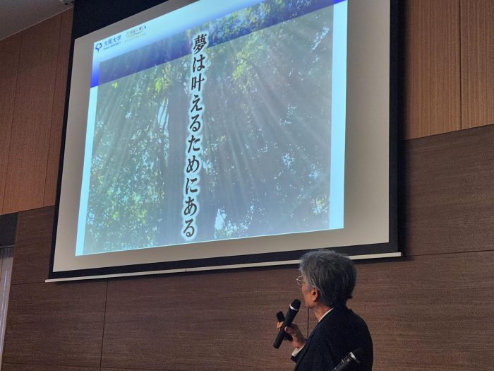 インターロイキン6を発見されたご自身の人生について話され、夢に向かって諦めず努力し続けることの大切さを熱弁されました。